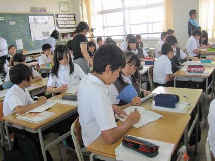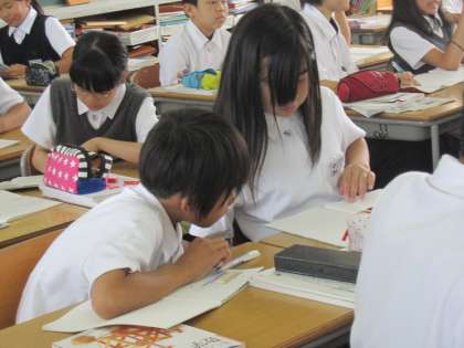 教科担当の先生の問いや指示に従い、個人思考→ペアー学習→班学習と落ち着いた中で、しっかりと考え、互いに意見を交流し、深める時間が持てている授業でした。
