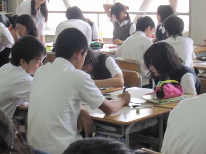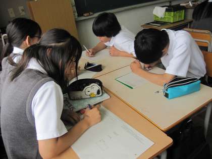 例題をやった後、班になり練習問題に取り組んでいます。先ず最初は自分で考えますが、どうしても分からないときや迷ったときには班の中で一緒に考えたり、教え合ったりしています。
