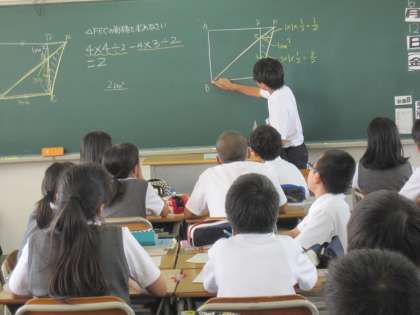 班で意見を出し合い新たに見つけた考え方を、代表がクラス全員に説明しています。