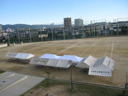 午前中の練習が終わった後、たくさんの生徒が明日の体育大会の準備を行ってくれました。テントが準備され、グランド整備も終わり、白いトラックのラインがきれいに引かれています。