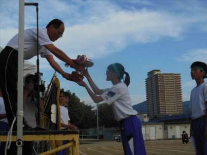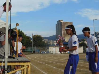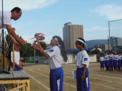 各学年の優勝クラスへの賞状とトロフィーが渡されています。