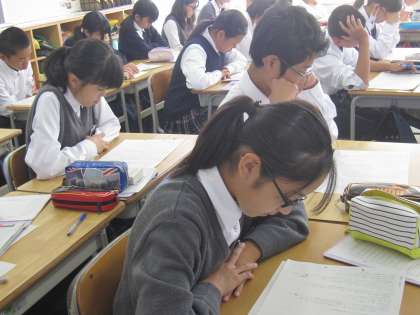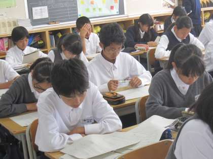 生徒は先生の範読に合わせ、教材のプリントを真剣に読んでいます。見事な集中と静けさです。生徒たちが教材の中に引き込まれています。