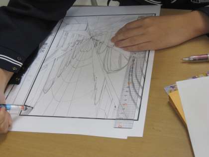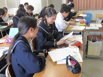 一番上と中央の写真は3年生の英語の分割授業の様子です。一番下は美術の作品に取り組んでいる様子です。
