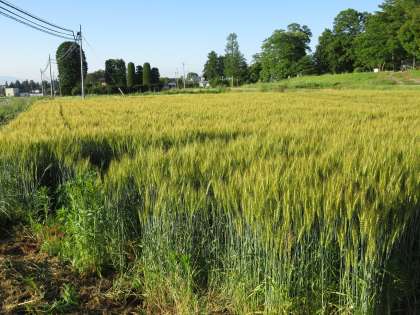 本部の宿舎近くには、朝日に輝く麦畑があります。