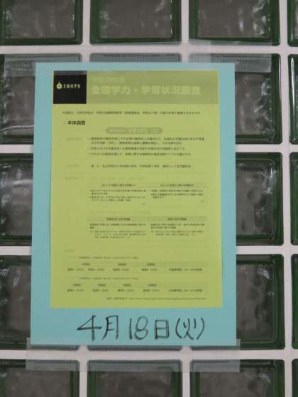 3年生の廊下には4月18日(火)の全国学力・学習状況調査のプリントが掲示されていました。3年生になって最初のテスト、全力で取り組んでくれることを願っています。