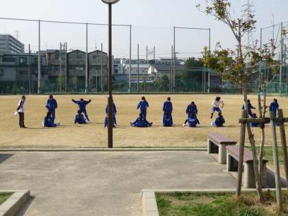 一番上は2年生の女子の体育です。ラジオ体操の後の体力づくりのための基礎トレーニングの場面です。
