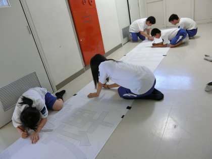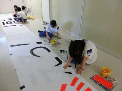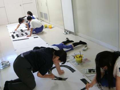 体育大会当時、体育大会のテーマを書いた横断幕をグラウンドネットに掲示しますが、その準備を美術部が黙々と進めています。