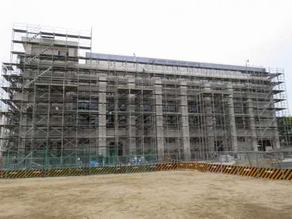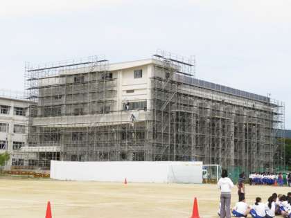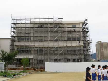 今日の工事で、これまで体育館を覆っていたシートのうち西面と南面のシートがはずされました。足場の解体も始まっています。