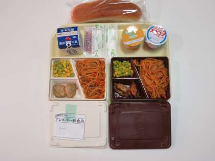 今日は、アレルギー食の様子を紹介します。1枚目は検食用の給食ですが、白い容器がアレルギー除去食、茶色の容器が普通食です。「乳」のアレルギー対応食となっています。デザートもヨーグルトがオレンジゼリーとなっています。牛乳がだめな生徒はお茶を各自用意するか、希望すれば代替食として豆乳を用意します。(これは毎日になります。)