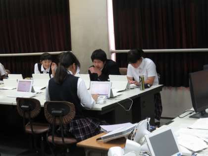 2年生の技術はパソコン教室で、ワードで「旅行計画を立てる」という授業でした。少し苦戦している生徒もいるようです。