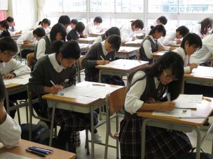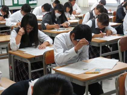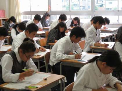 3年生の受検風景ですが、どのクラスも真剣にテスト問題に取組んでいます。