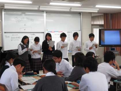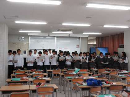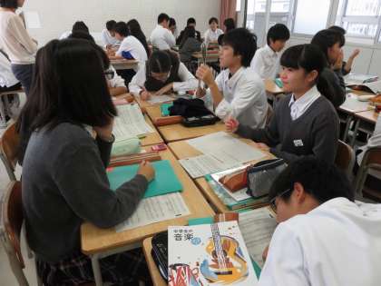クラスで選んだ自由曲をより豊かに表現するにはどうすればよいか、班ごとに楽譜や歌詞を読み込み、考えを整理しその内容を発表し、実際に歌ってみるという授業内容でした。