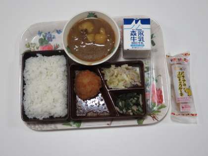 今日は、白ごはん・ミンチカツ・キャベツとハムのサラダ・小松菜としめじの炒め物・カレーシチュー・牛乳が基本献立ですが、今日が創立記念日の南郷中には「お米deバナナスティックケーキ」がスペシャルデザートとしてついています。