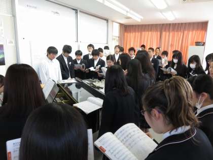 今日の2時間目、3年生の音楽の授業風景です。ピアノを囲みみんなで楽しそうに歌っています。