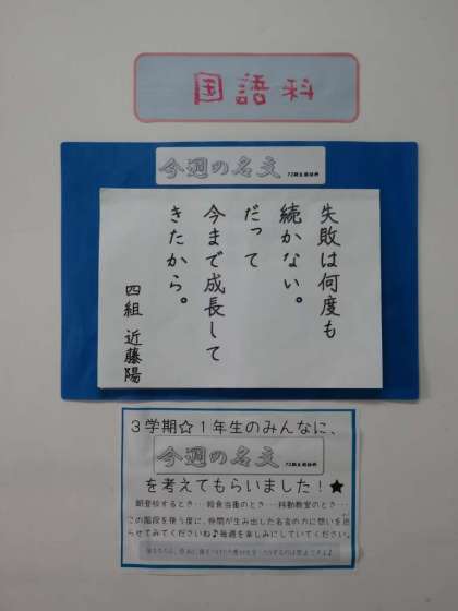 廊下には、1年生の国語の授業で取り組んだ「今週の名文」が掲示されています。