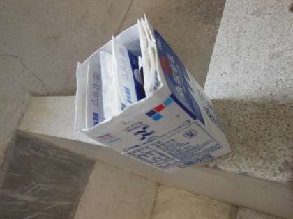 一つの牛乳パックを開いてそこにたたんだ牛乳パックをいれるているようです。