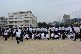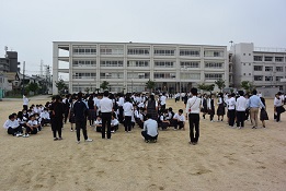 整列後、頭部を守る話をしようとしたところ、自分で考えて頭を守るために教科書を持って非難した生徒がいました。自分の身を守るために何をすればいいかを考えての行動がとれていて素晴らしいことだと思います。これからの避難訓練でも大切にしてもらいたいことです。