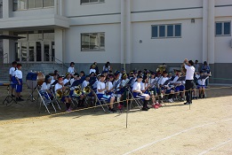 写真は青空の下で集合し、吹奏楽部の準備ができ、開会式の行進の用意が整ったところです。