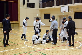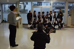 卒業アルバム用のクラブ写真の撮影です。グランドを使用するクラブはあいにくの雨になり体育館や玄関での写真撮影となっています。