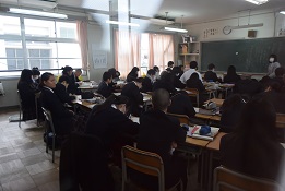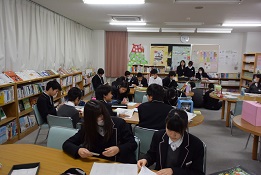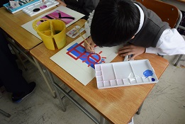 2年の国語の授業と1年の美術の授業での真剣な筆運び、図書館を利用しての2年生国語の授業の写真です。