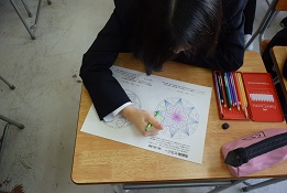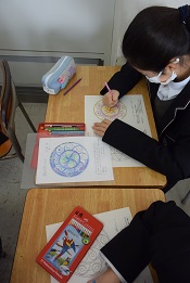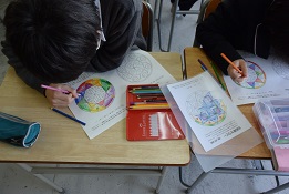 美術の授業では色鉛筆で、グラデーションや混色のテクニックを使っての作品づくりが行われています。