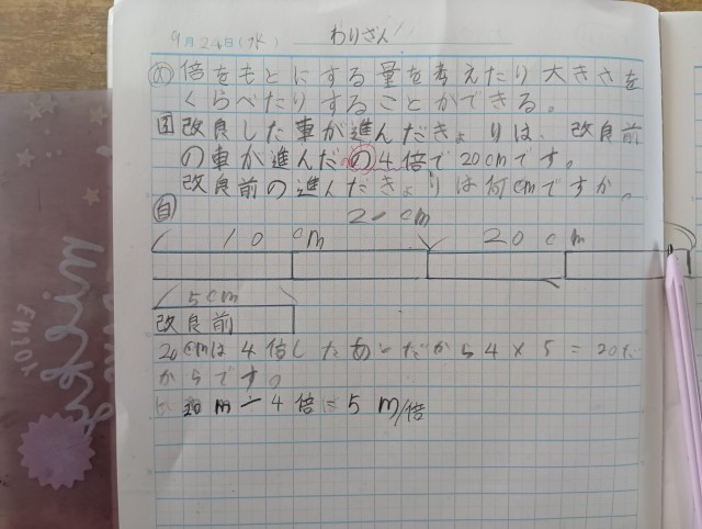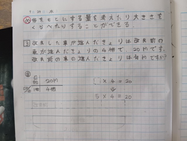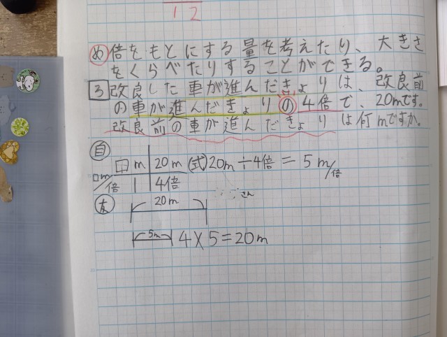 4年生の算数科では、「倍の見方」の学習で倍の大きさや、くらべられる量がわかっているときのもとにする量を求める方法を考えていました。