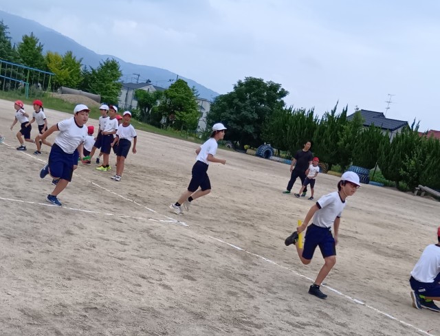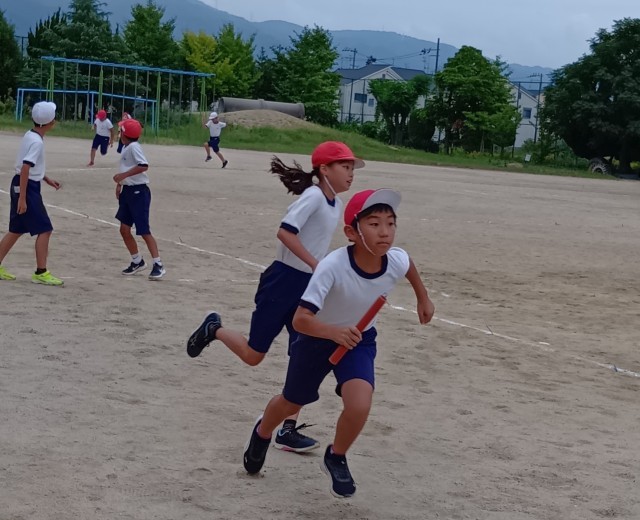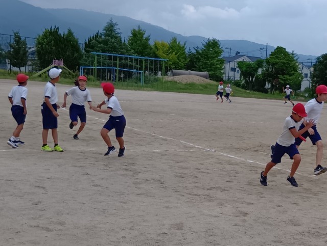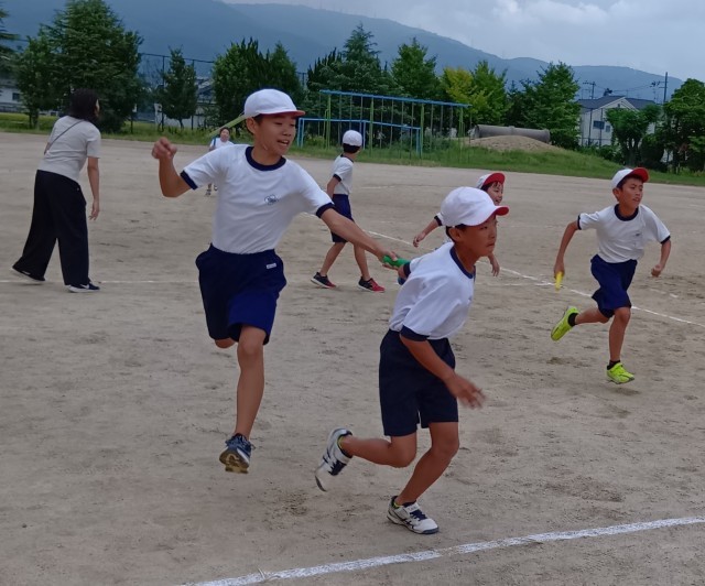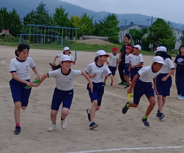 5年生は、運動場でリレーをしていました。