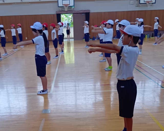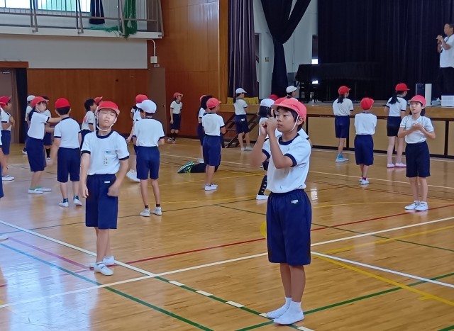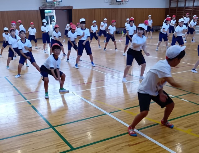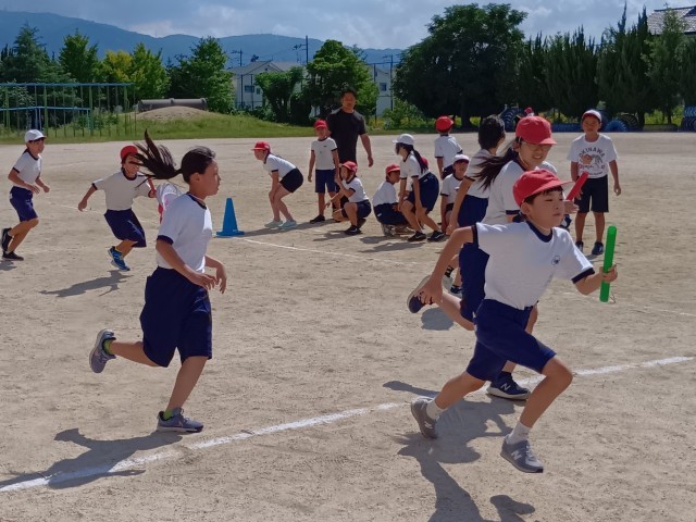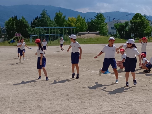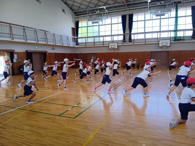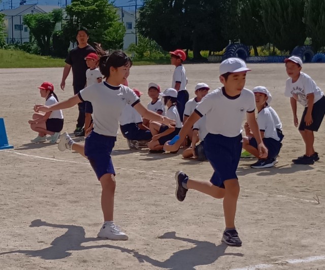 5年生が体育館ではエイサー、運動場ではリレーを頑張っていました。