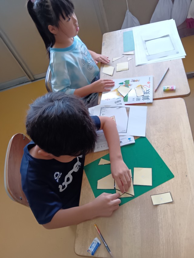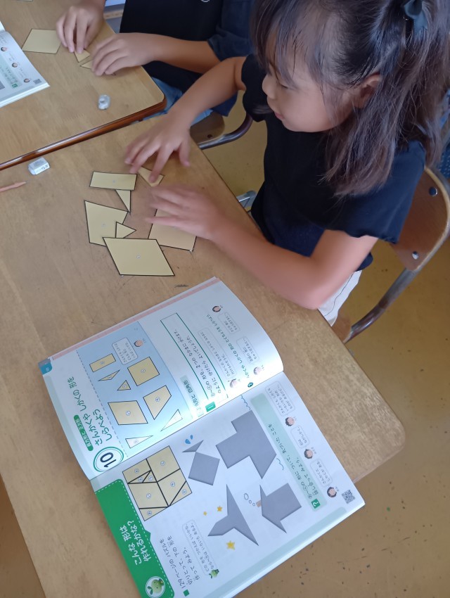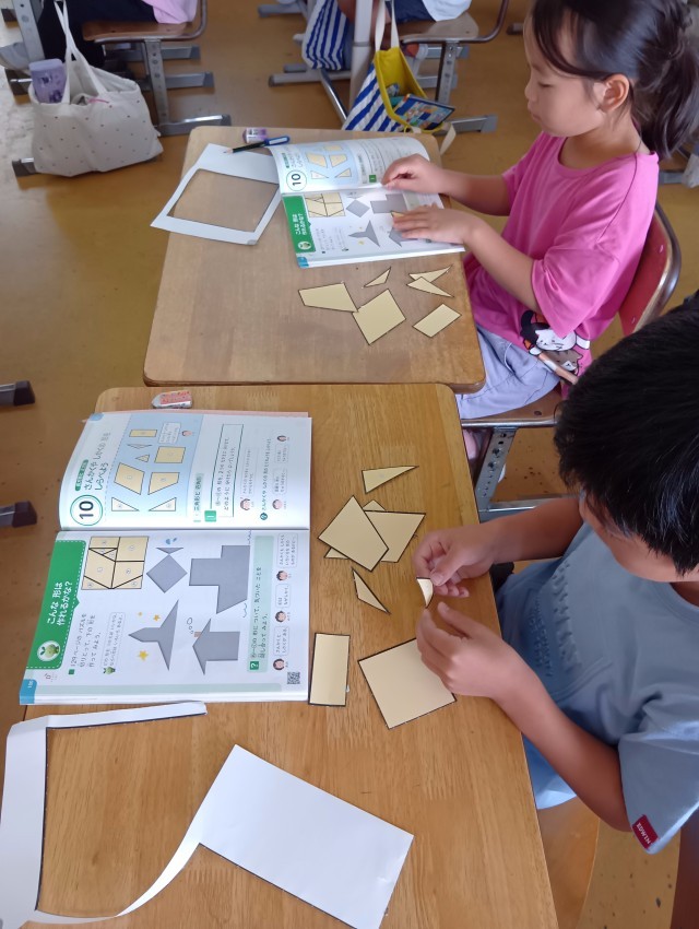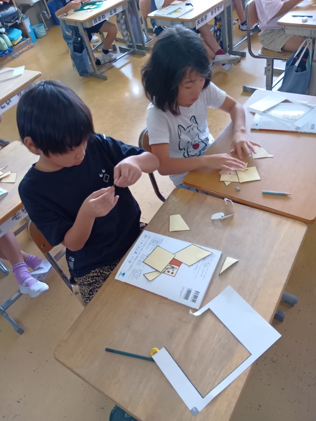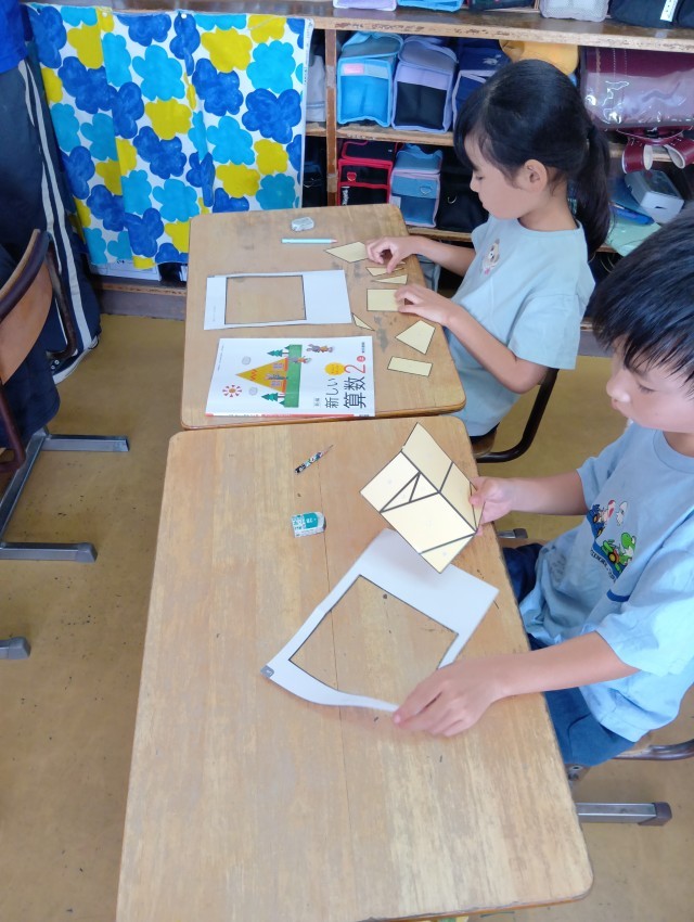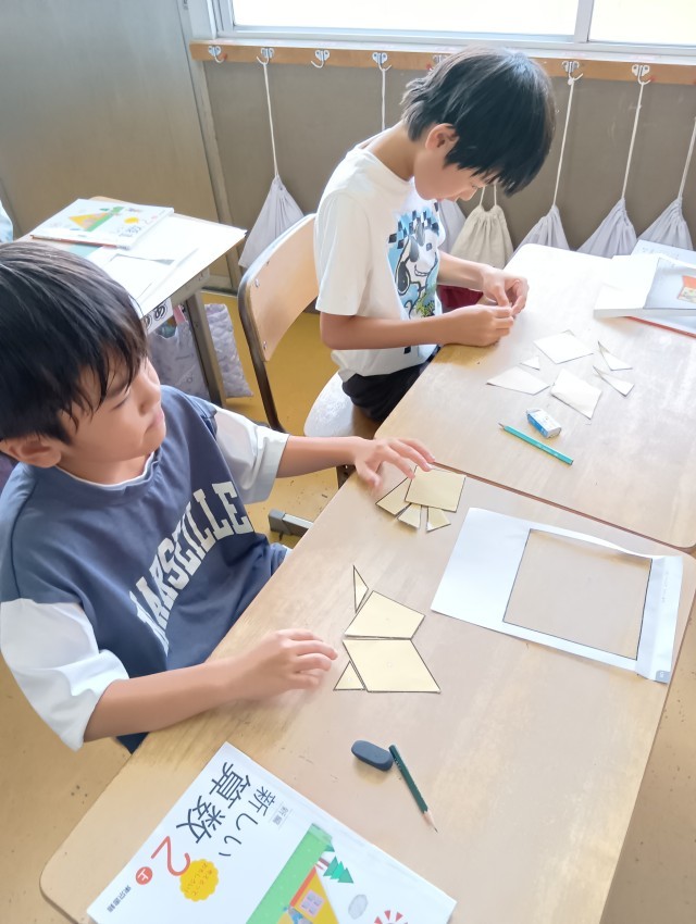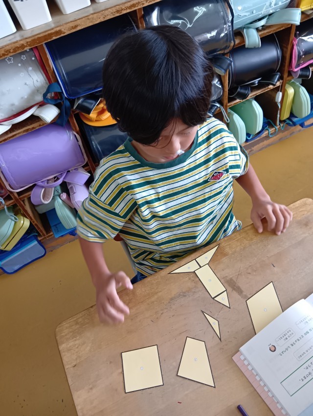 教科書についている形の紙を切り取って実際に並べてみます。