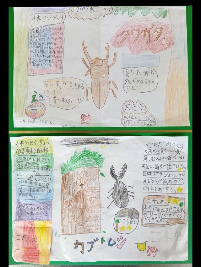 自分で問題を作ったり、頭・むね・はらの部分がよくわかる絵をかいたりと読む人を意識して一生けん命作っている様子が伝わります。