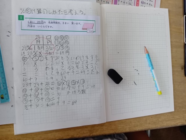 3年生の算数科では23×3の計算のしかたを考えていました。