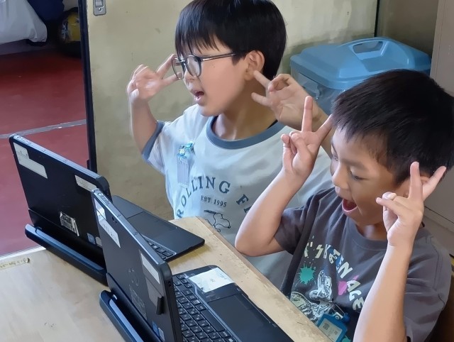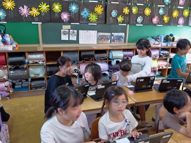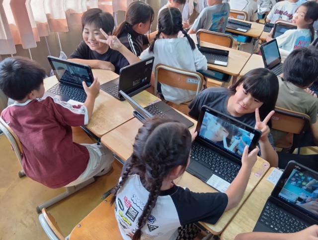 ペア学年として4月からいろいろな活動を共にしてきた1年生と6年生が、タブレットのカメラ機能を使って写真を撮り合っていました。