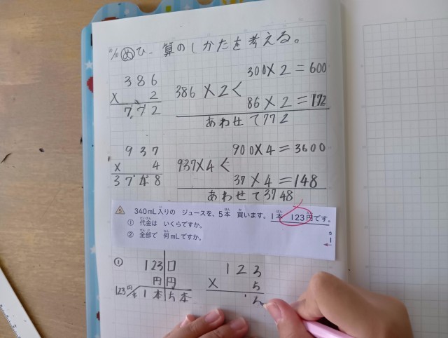 3年生の算数科では、かけ算の筆算の学習をしていました。ジュースの代金やジュースの量、求めるものによって1あたり量を正しく見つけます。