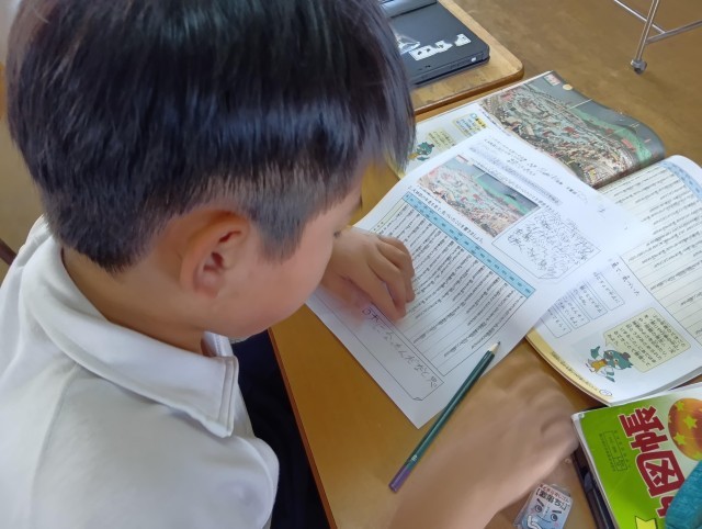 4年生の社会科では、資料の年表や絵から読み取ったことをまとめる学習をしていました。