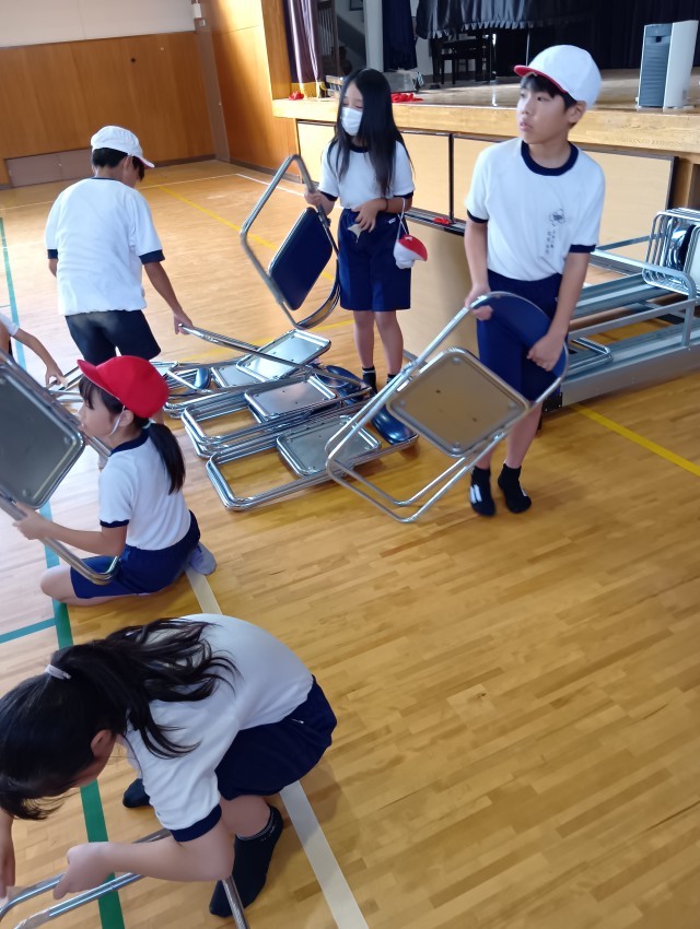 体育館では、パイプ椅子に砂が入らないように、ガムテープを巻き付ける作業をしてくれている係がありました。