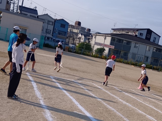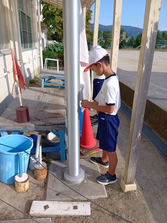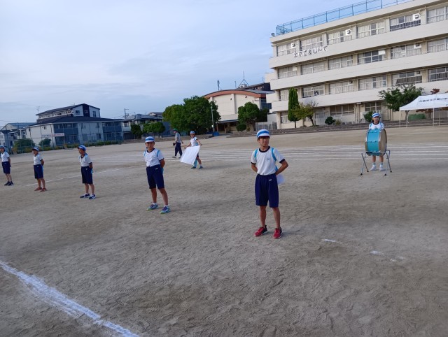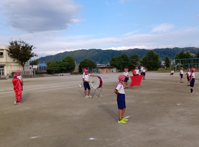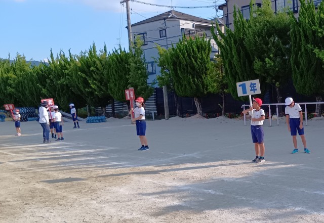 運動場では、プラカードの係や応援団、ゴールテープを持つ係、校旗などを揚げる係も練習しています。