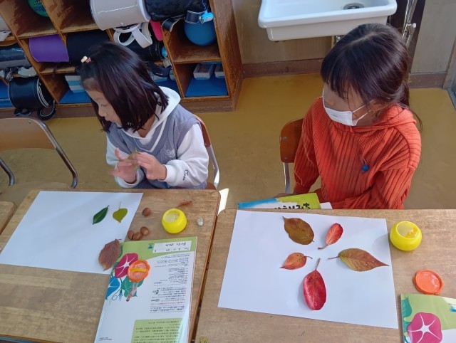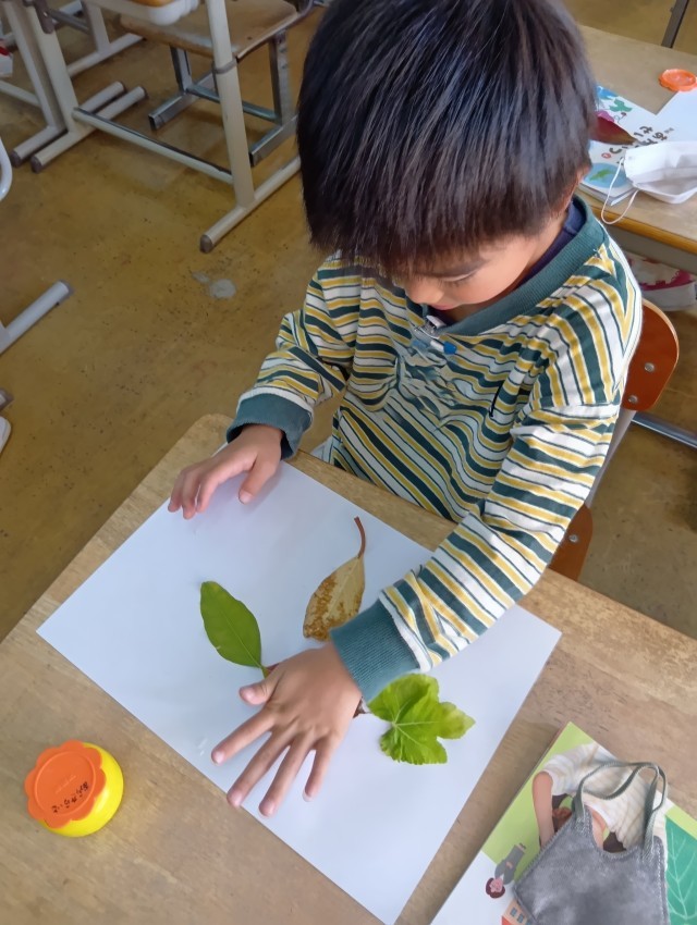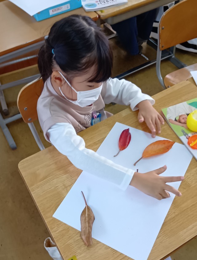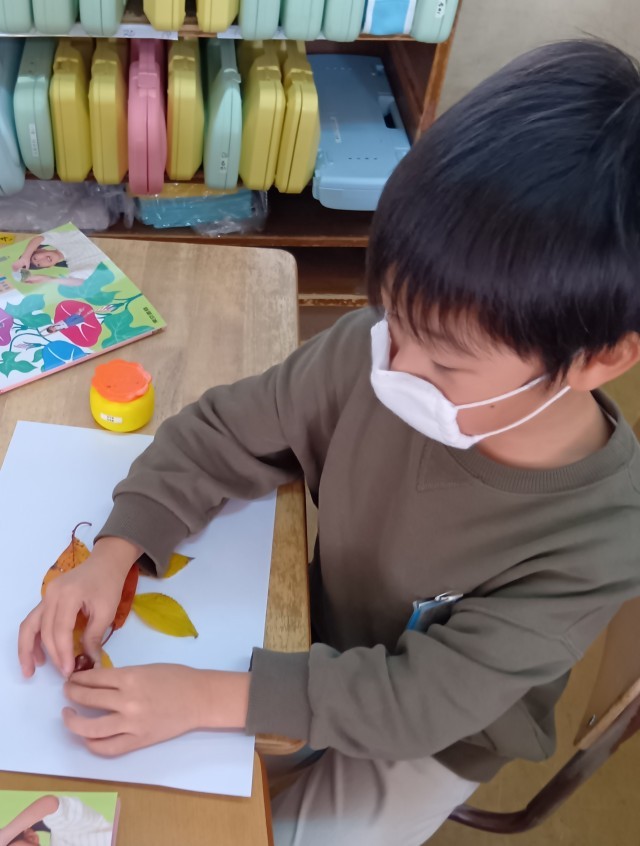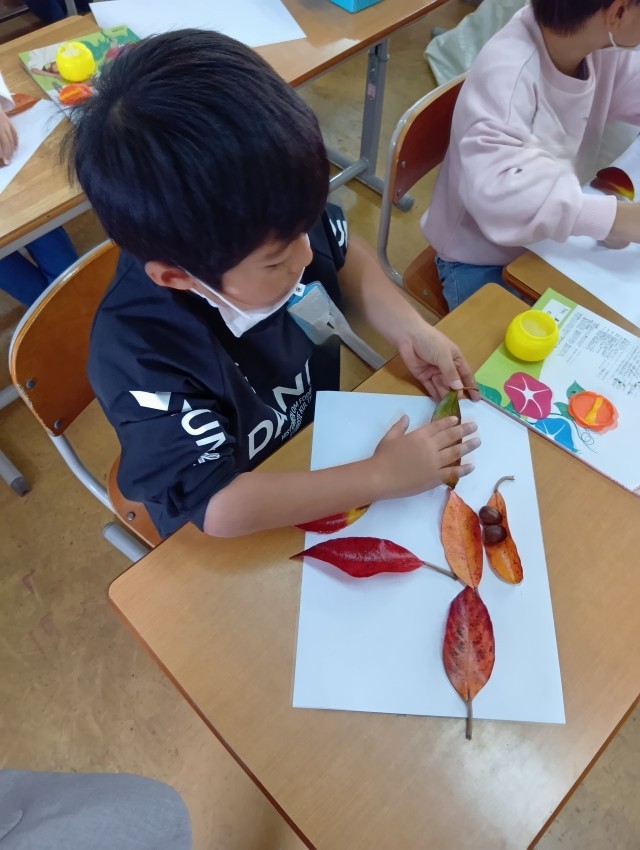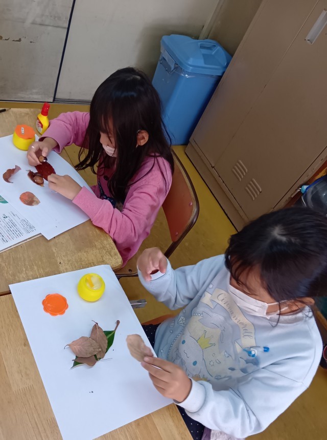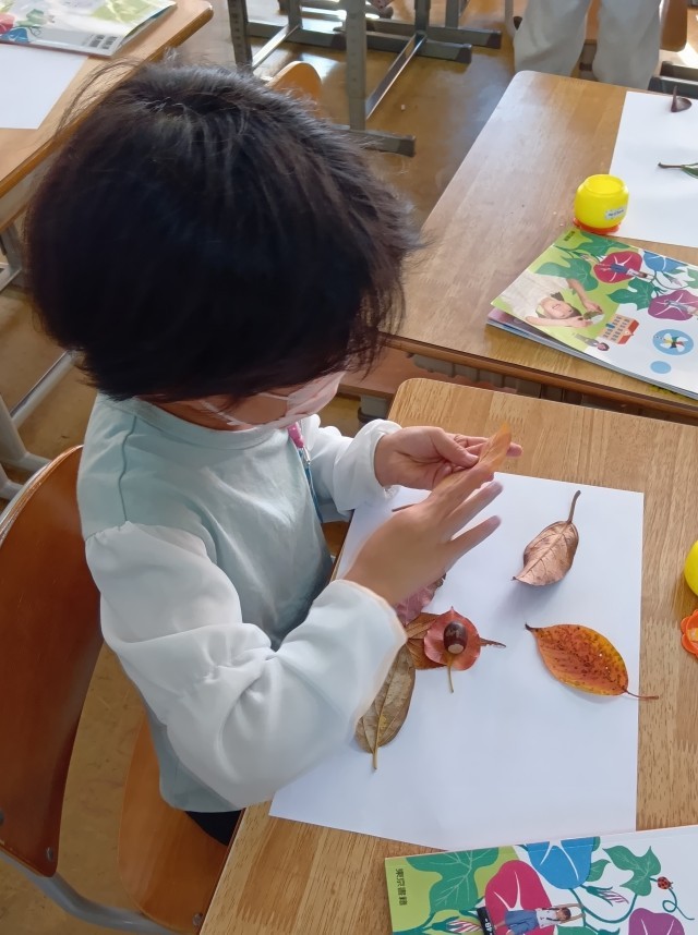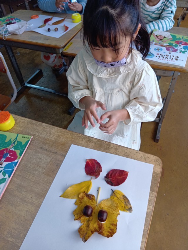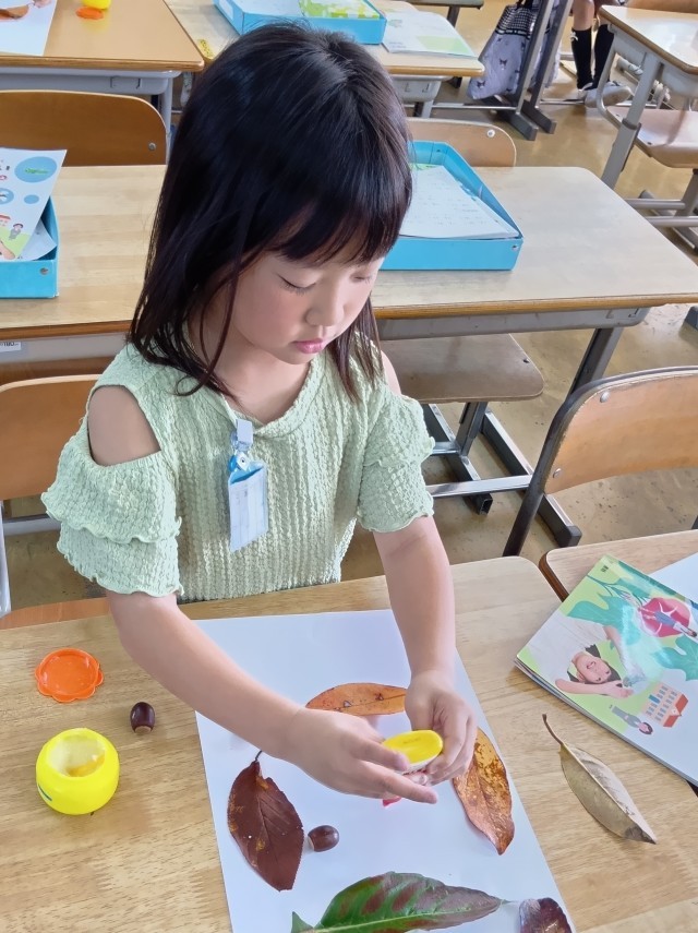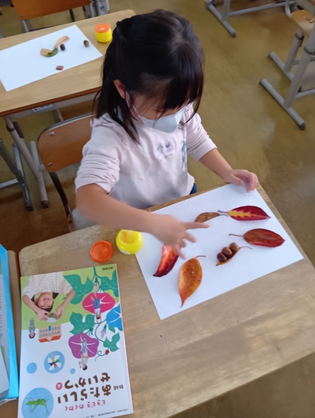 1年生は、きれいな色のはっぱを集めて、どんぐりと組み合わせて、はっぱモンスターをつくっていました。