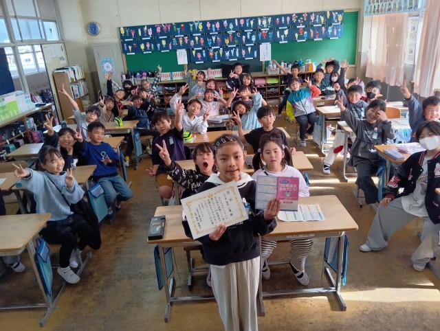 教室で表彰して、記念撮影です。クラスのみんなも大拍手で大喜びでした。