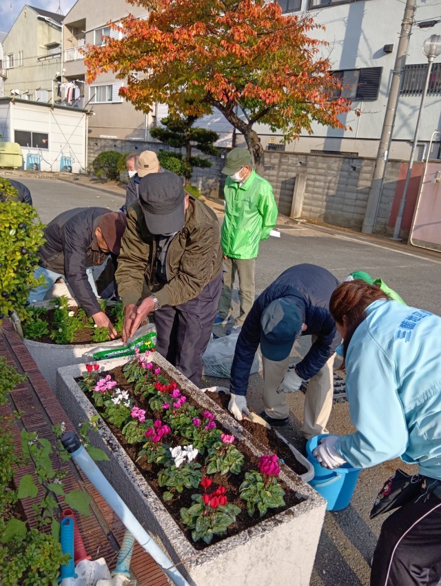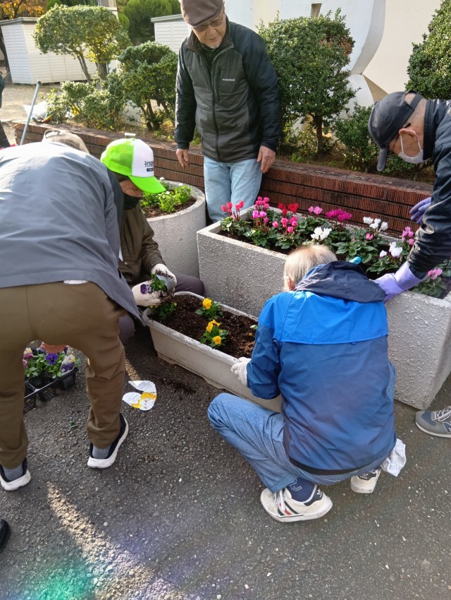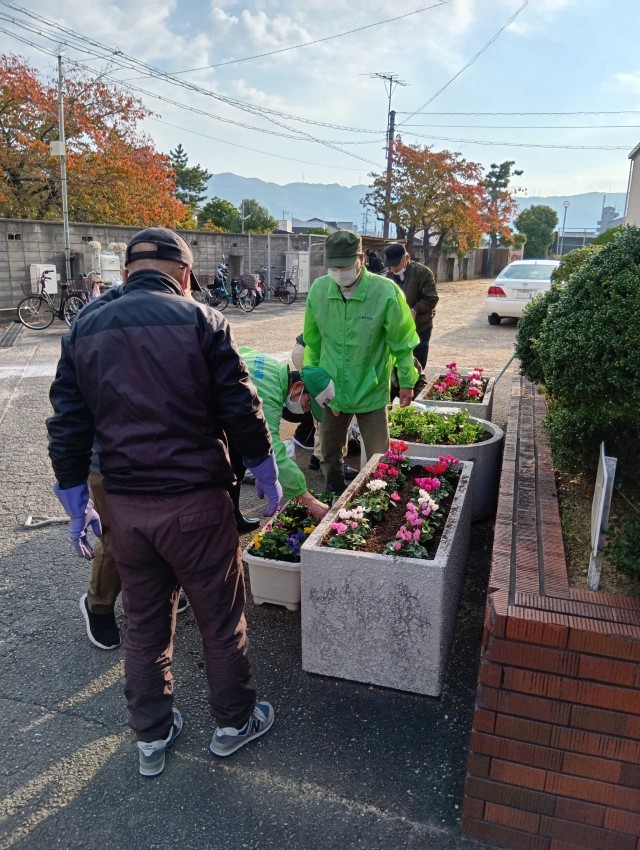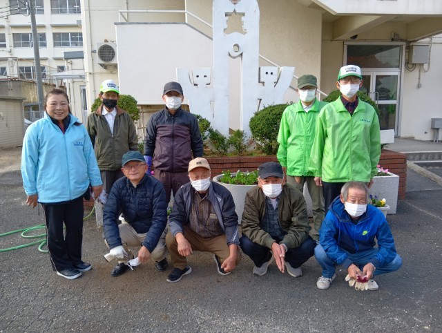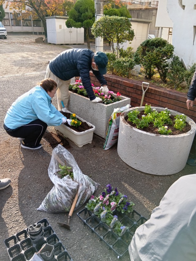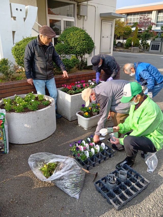 今日は、おはよう運動のあと、正門の花壇の花を植え替えてくださいました。