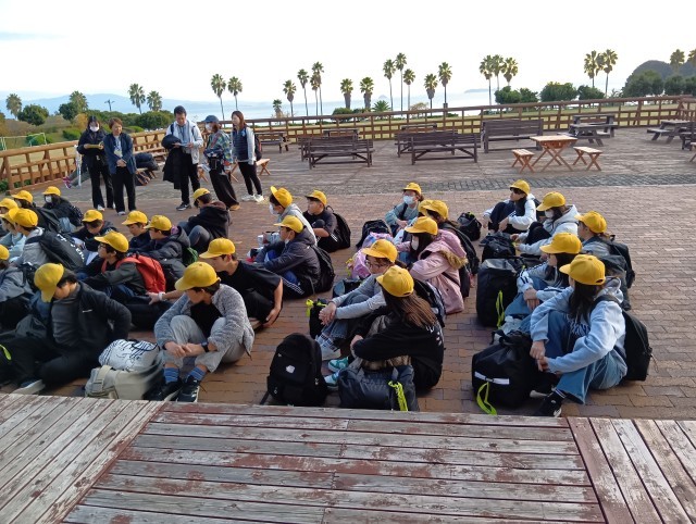 少し早く着いたので、ちょうど美しい夕日と素晴らしい景色をバックにクラス写真を撮りました。
