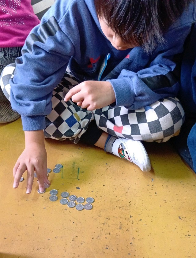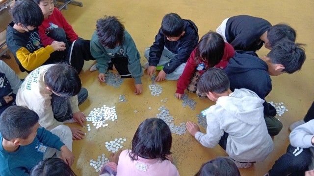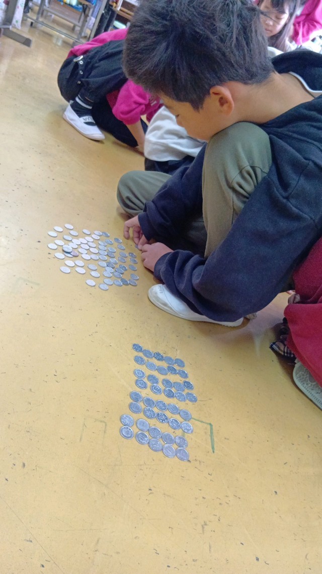 「みんな次は、20個ずつ取ろう!」「まだいっぱいある。」「じゃあ、50個ずつ取ろう!」
