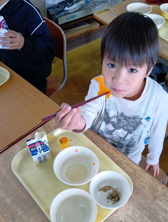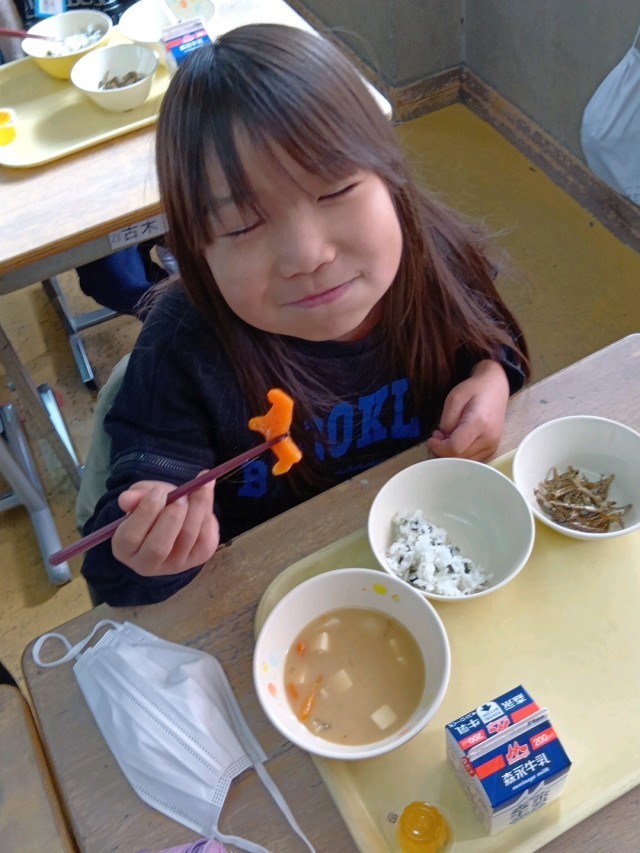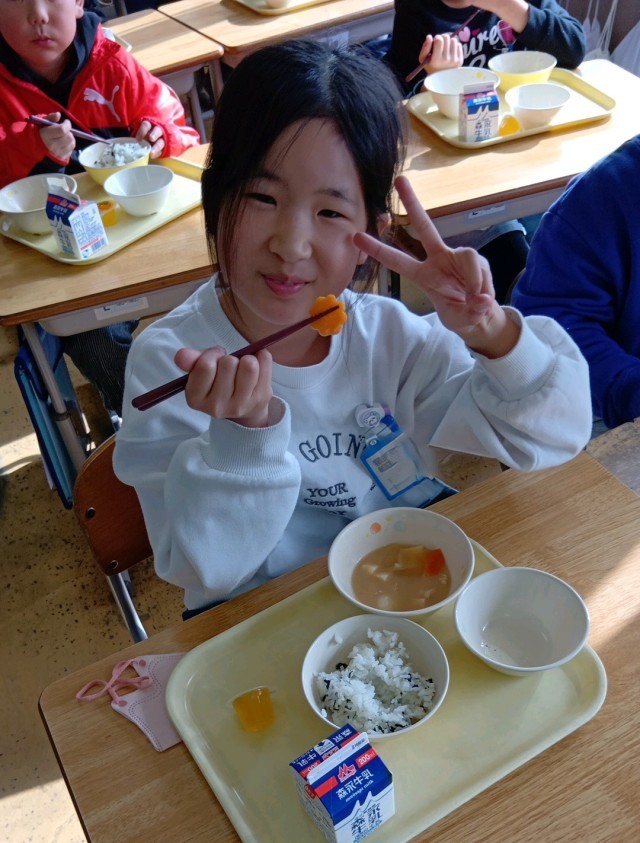 教室をのぞいてみると、笑顔でにんじんや大根を見せてくれます。
