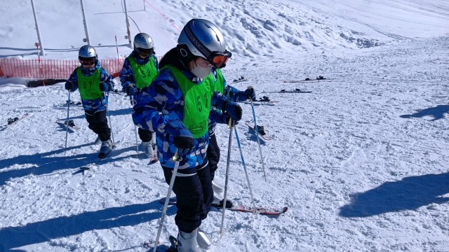 1日目のスキー学習、何度転んでも、なんとか起き上がり、立ち上がって頑張る姿がたくさん見られました。