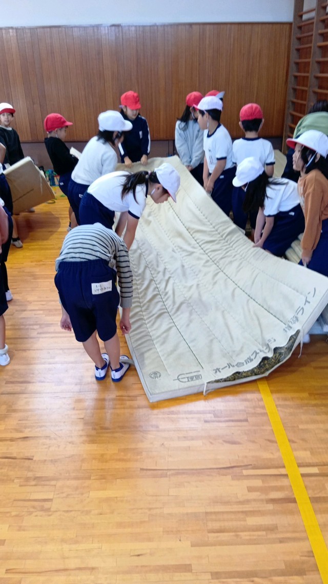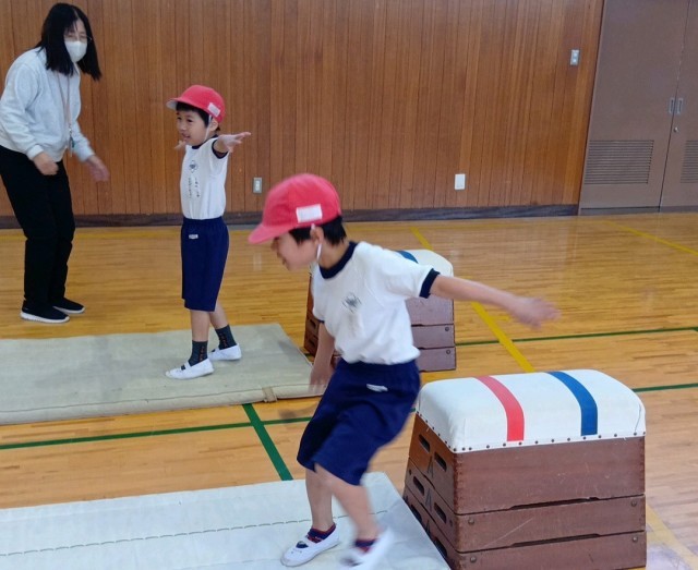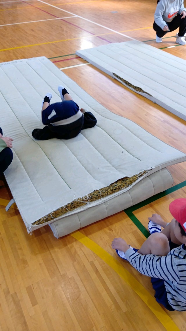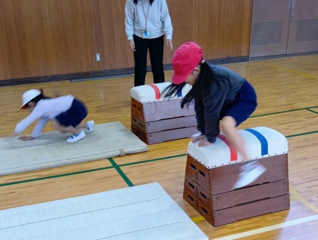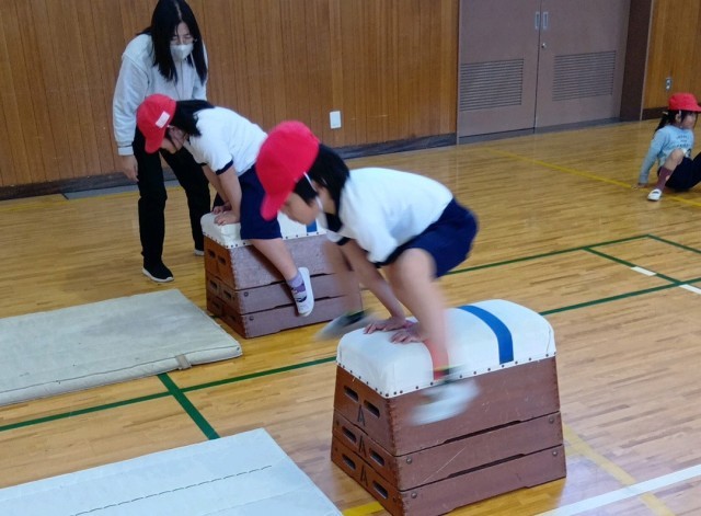 1年生の体育の学習です。とび箱とマットをしています。
