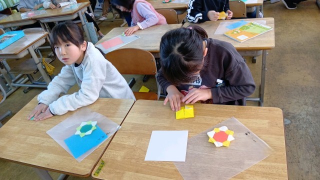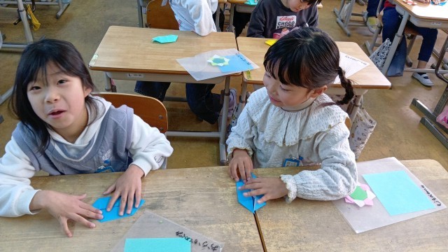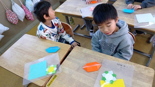 1年生が折り紙を折っています。なかなか難しそうな折り方でした。