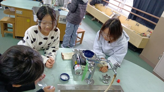 食塩水を蒸発させるとどうなるか、実験しています。