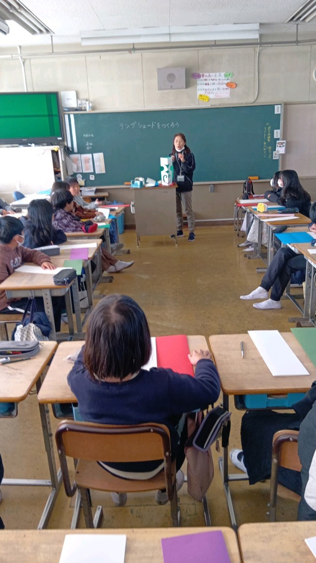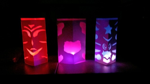 色画用紙と画用紙でランプシェードを作ります。電球は100円ショップなどで売っているそうです。