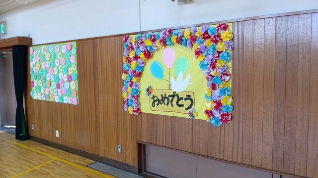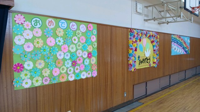 体育館の壁面は、各学年で作った「おめでとう」の掲示物で飾られています。