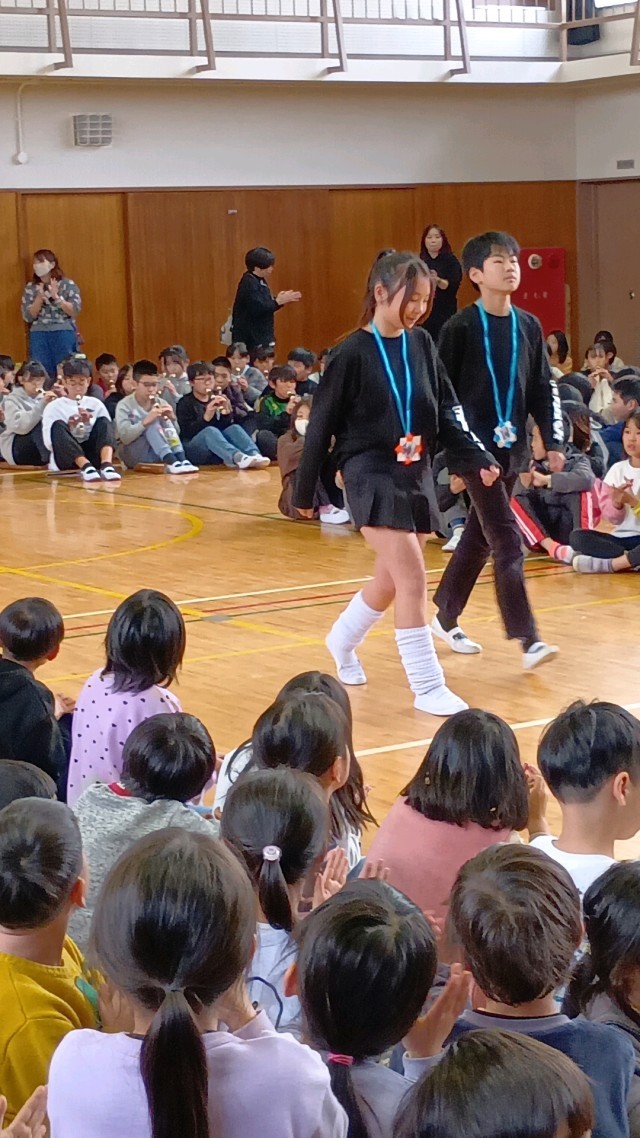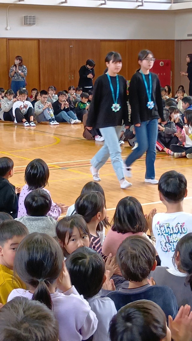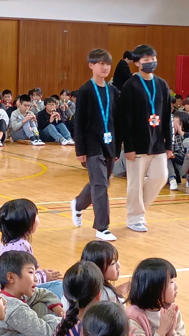 6年生の入場です。胸には、1年生が作ったプレゼントのメダルが光ります。