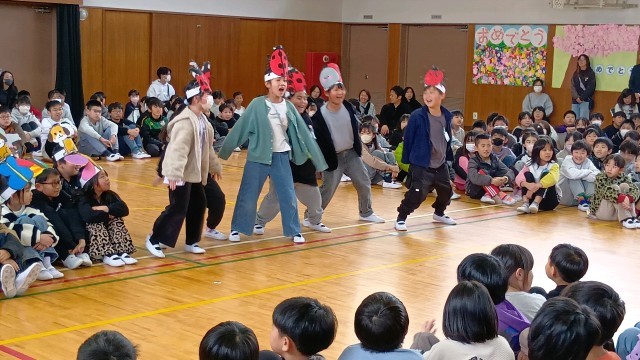 3年生は、動物や昆虫のお面をつけて、「たんぽぽ」の歌と言葉で「おめでとう」を伝えます。
